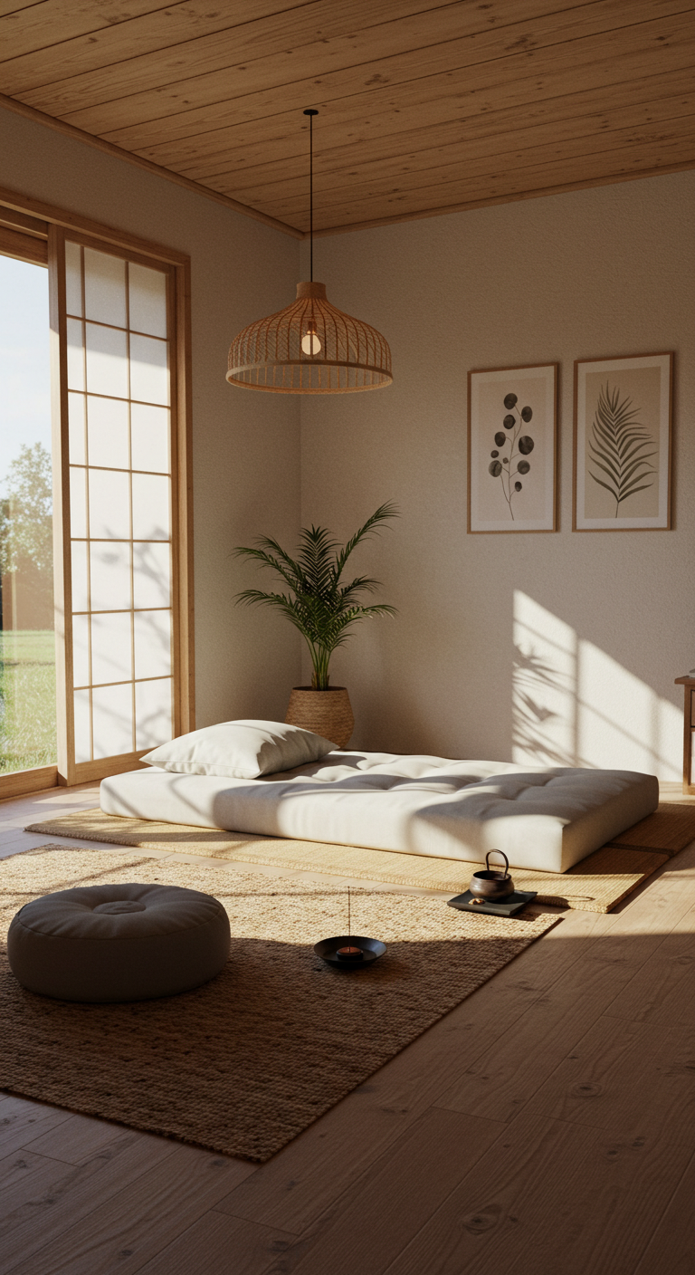 Le concept de lit au sol pousse le minimalisme à son paroxysme en supprimant toute structure superflue. Cette approche radicale crée un environnement de paix absolue et favorise un mode de vie simplifié.