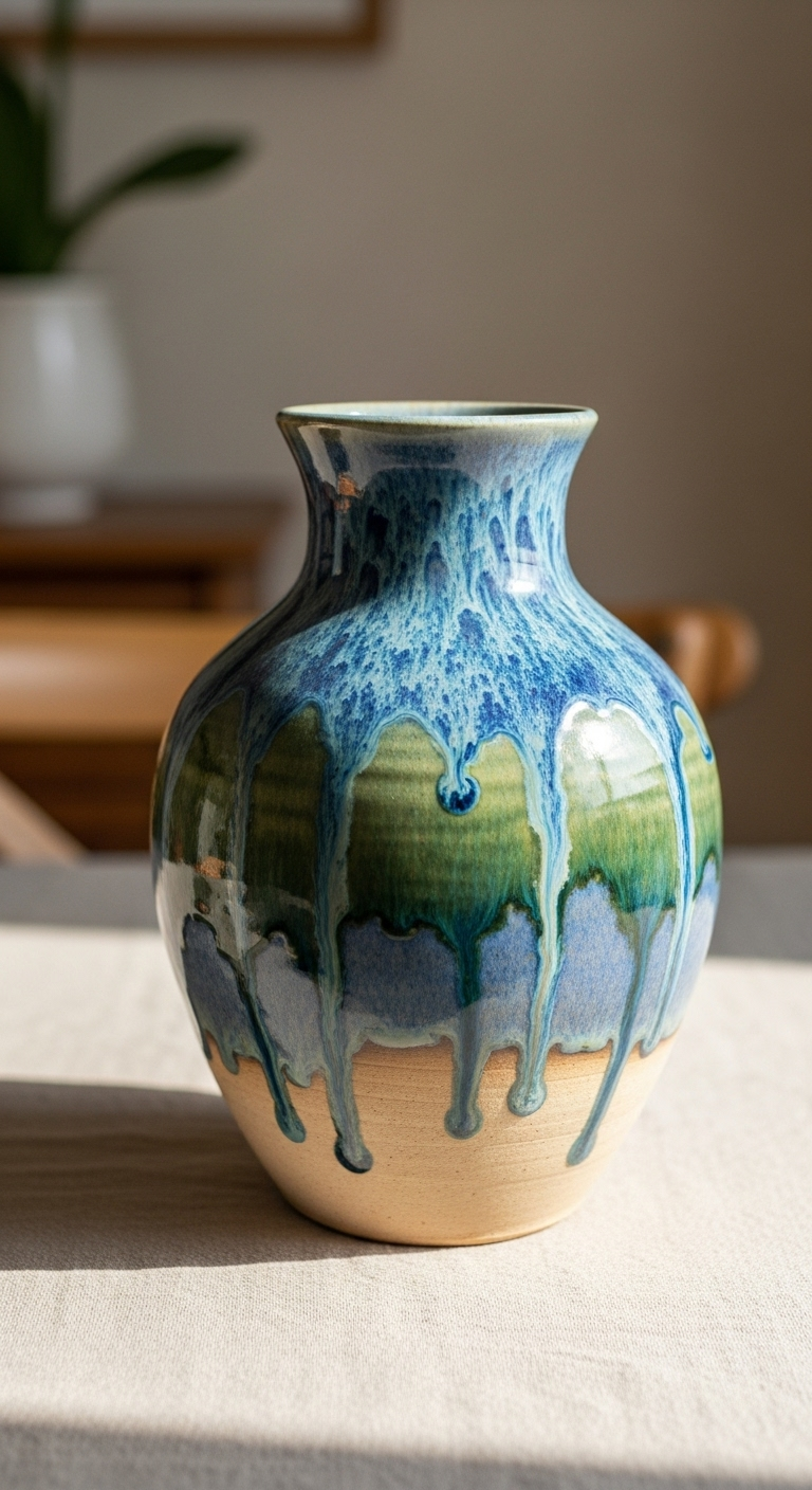 La magie de la céramique artisanale opère pleinement avec ce vase à glaçure réactive. Chaque pièce est unique, les couleurs se mêlent et réagissent lors de la cuisson pour créer des motifs organiques impossibles à reproduire. C’est comme posséder une œuvre d’art en constante redécouverte.