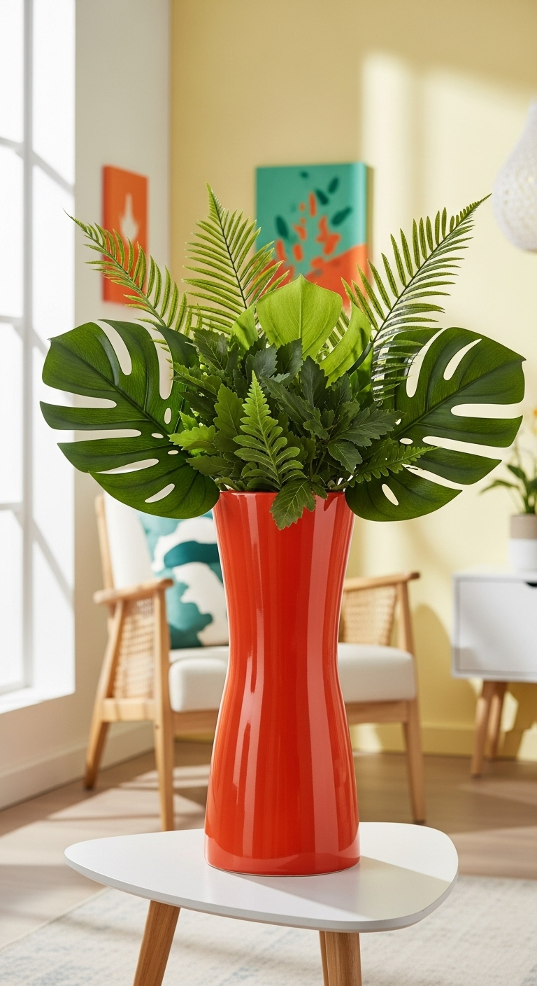 Conseil styling : Osez le clash chromatique en l’associant à des couleurs complémentaires, ou créez une collection de vases colorés pour un effet galerie pop art. Les plantes vertes tropicales font ressortir magnifiquement les tons chauds.