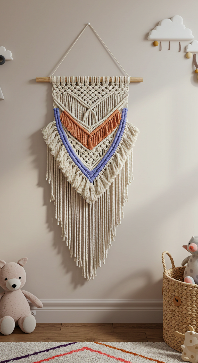 Le macramé coloré apporte instantanément une touche artisanale et chaleureuse à la chambre. Créez ou achetez une grande suspension murale en macramé utilisant des fils de coton dans des teintes pastel ou vives selon l’ambiance souhaitée.