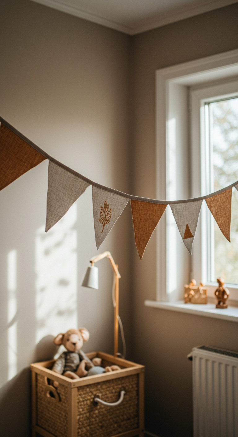 Les guirlandes de fanions en tissus naturels comme le lin, le coton bio ou la gaze de coton apportent mouvement et couleur sans surcharger l’espace. Optez pour des teintes terreuses mélangées à des pastels pour un effet bohème authentique.