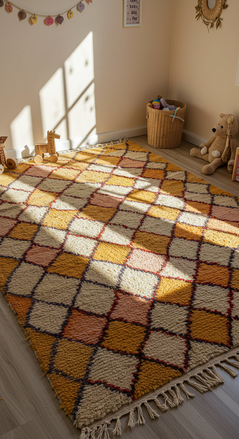 Un tapis berbère aux motifs géométriques colorés ancre parfaitement l’espace de jeu tout en apportant chaleur et confort. Ces tapis, traditionnellement tissés à la main, offrent une texture riche et des motifs fascinants qui stimulent la curiosité des enfants.