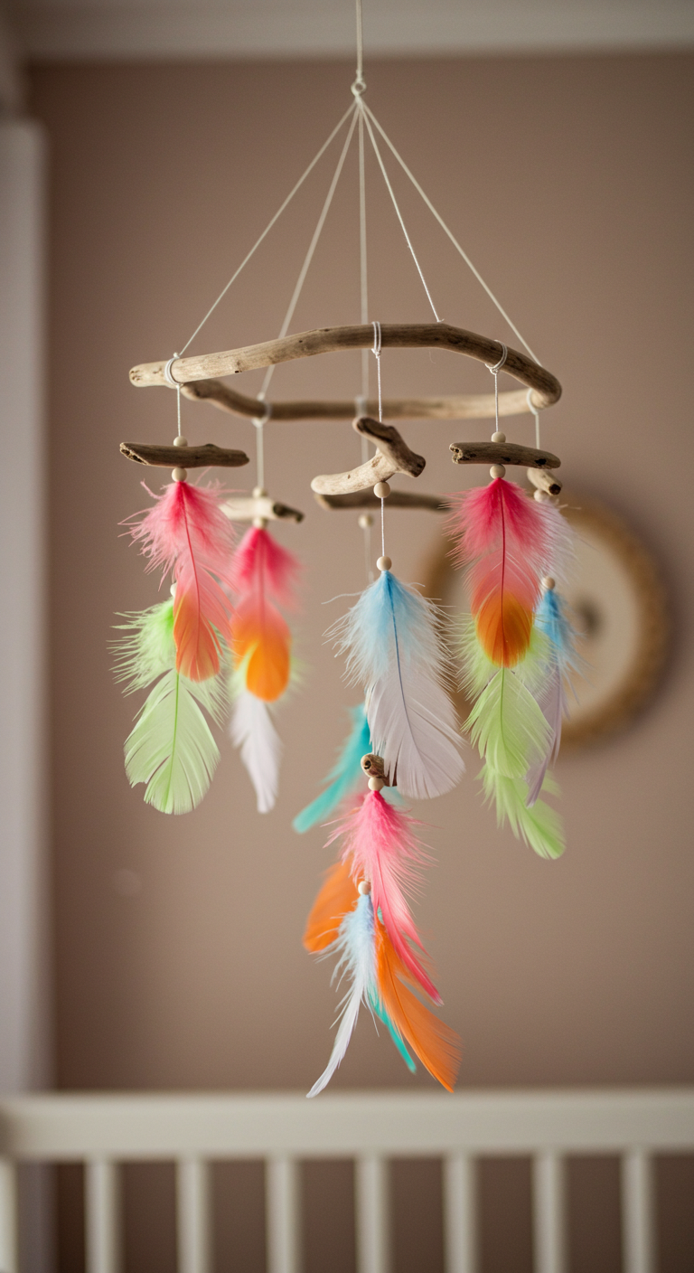 Créez un mobile unique en combinant bois flotté et plumes teintées dans des couleurs douces. Cette création artisanale apporte une dimension naturelle tout en stimulant la vue avec ses mouvements délicats.