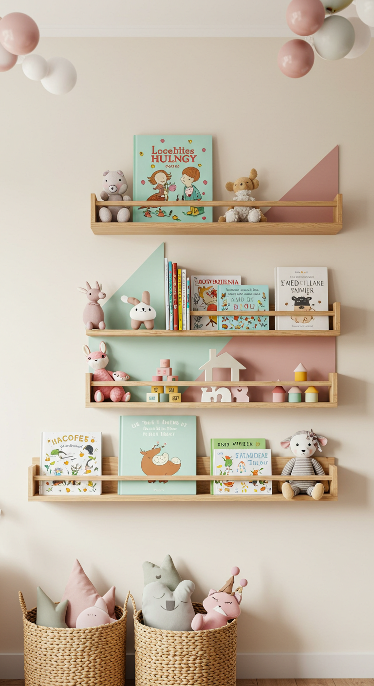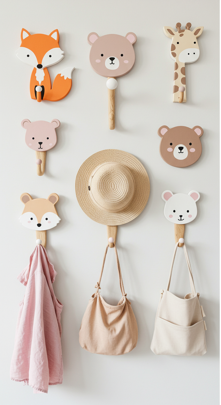 Transformez le rangement en jeu avec des patères murales sculptées ou découpées en formes d’animaux et peintes dans des couleurs douces. Ces éléments fonctionnels deviennent des accessoires déco à part entière.