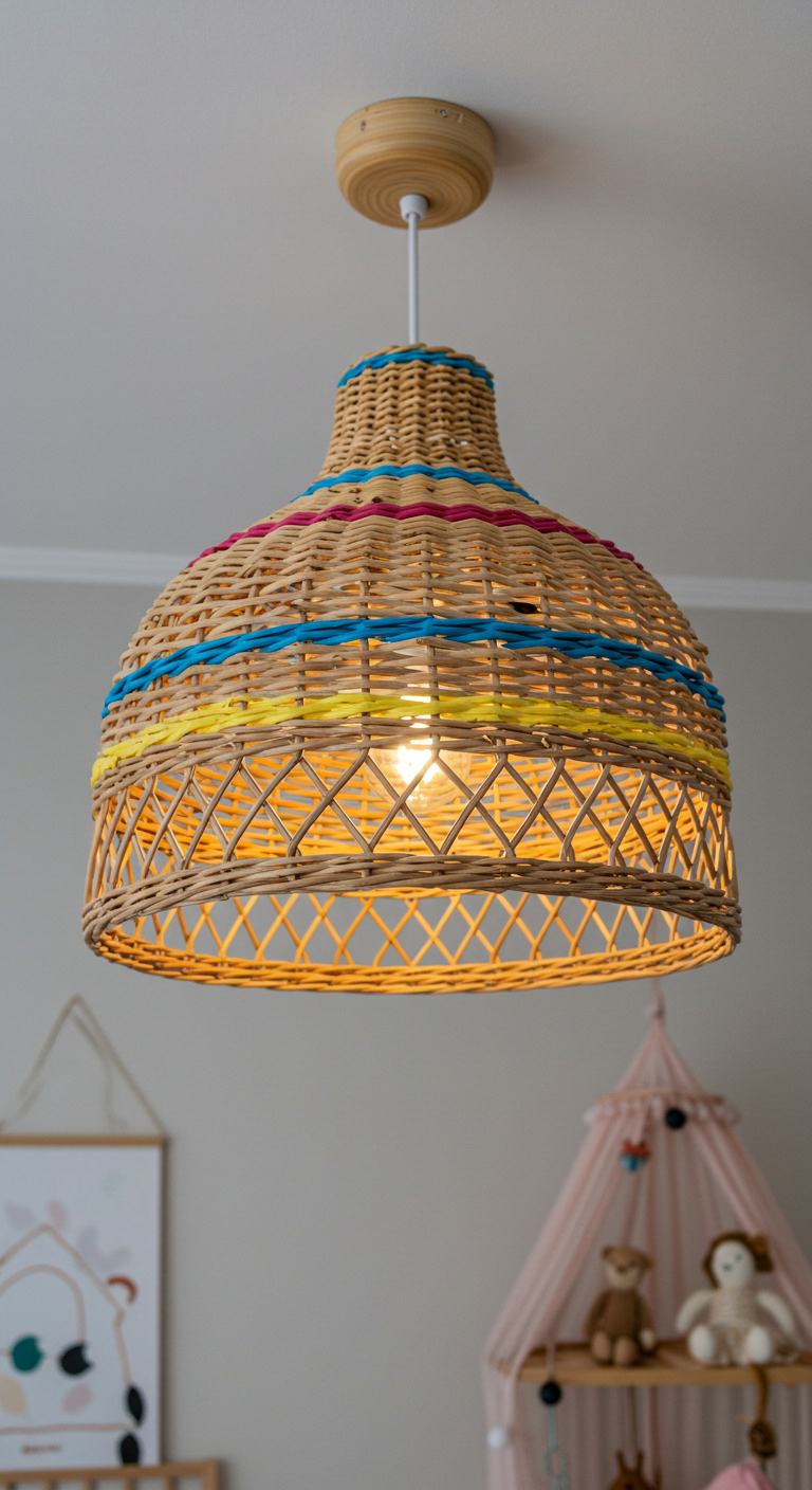Un luminaire en rotin partiellement peint dans des couleurs douces diffuse une lumière tamisée tout en servant d’élément décoratif central. Le tressage naturel crée des jeux d’ombres fascinants sur les murs.