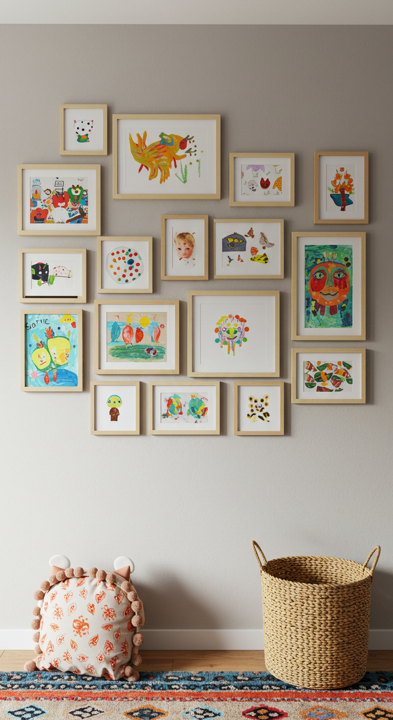 Cette gallery wall évolutive peut grandir avec l’enfant, accueillant nouveaux dessins, photos de famille, et souvenirs précieux. L’aspect naturel des cadres s’intègre harmonieusement dans le style bohème recherché.
