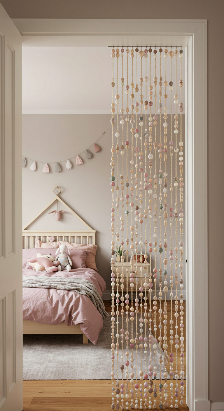 Ce rideau peut séparer l’espace sommeil de la zone de jeu, ou simplement décorer une ouverture. Le cliquetis délicat des perles ajoute une dimension sonore agréable qui participe à l’ambiance sensorielle de la chambre.