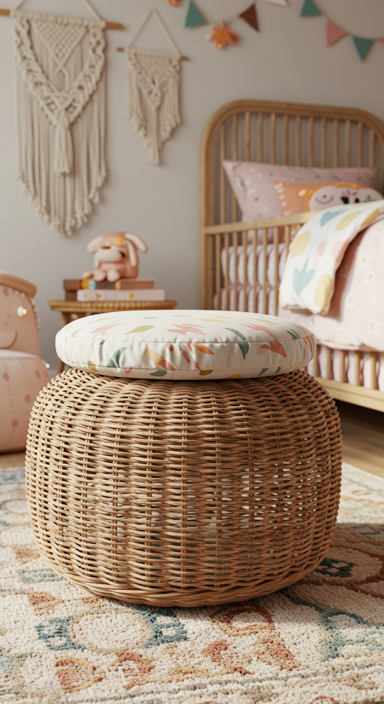 Un pouf en osier naturel coiffé d’un coussin coloré amovible combine fonctionnalité et esthétique bohème. Il peut servir d’assise d’appoint, de table basse ou de rangement selon les besoins.