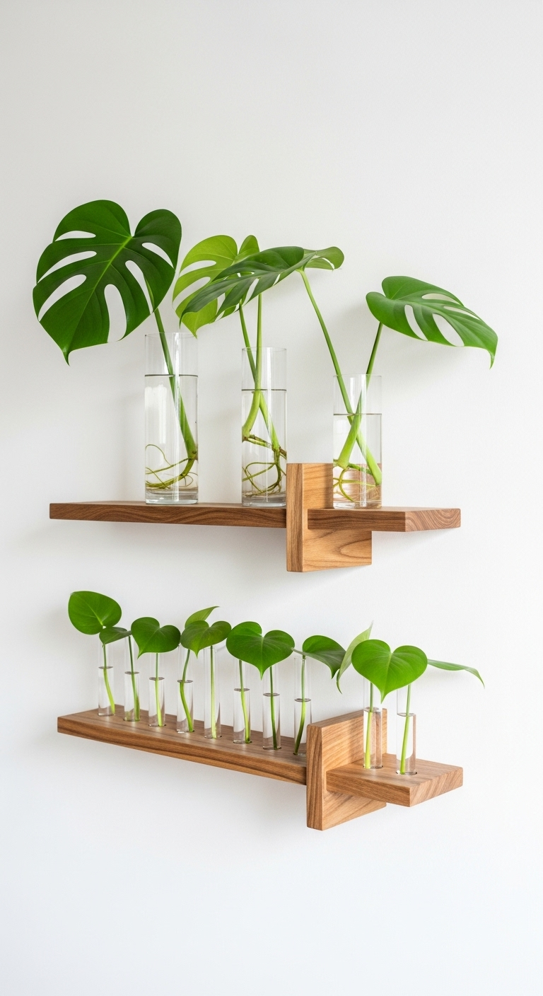 2. Étagère Murale Minimaliste avec Boutures de Monstera