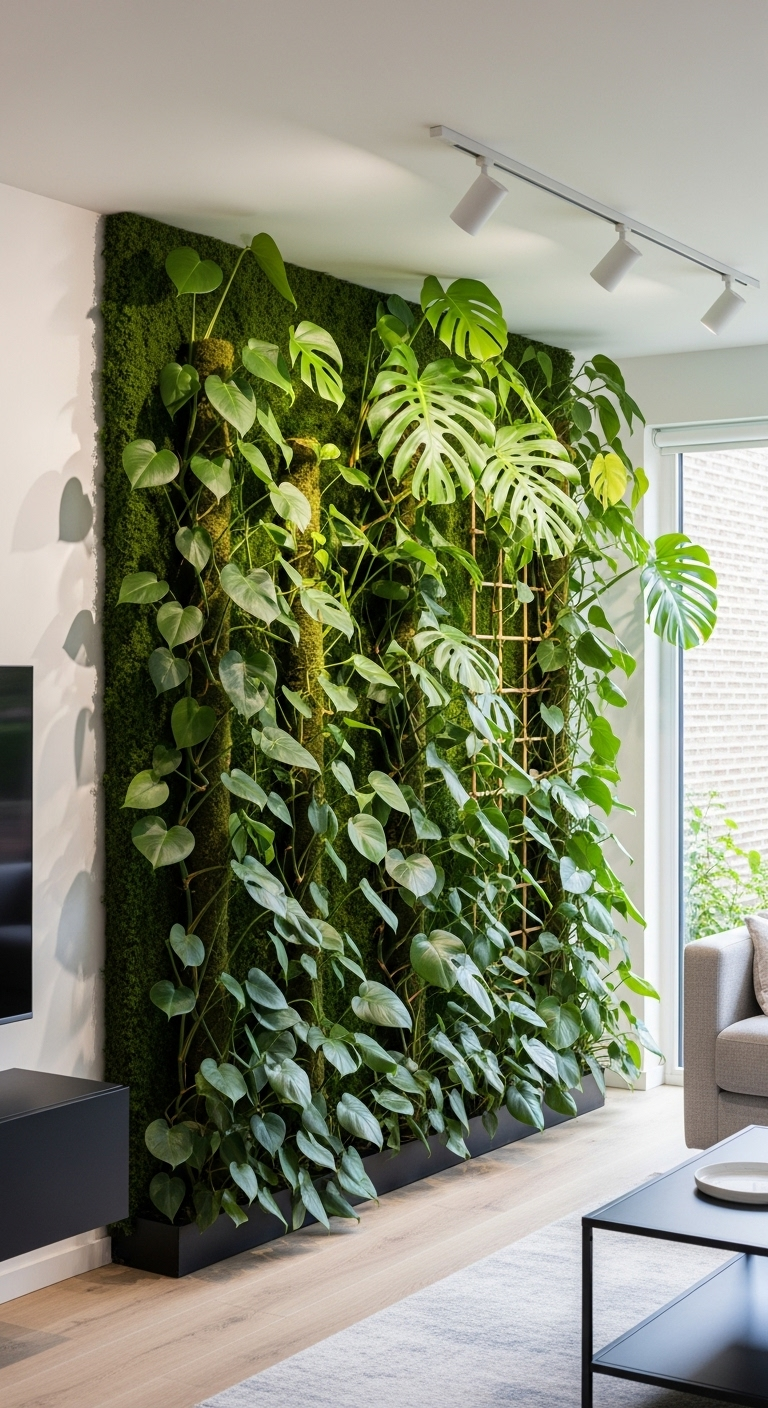 Comment réaliser cette idée : Utilisez plusieurs Monstera de tailles variées et guidez-les sur des tuteurs en mousse ou des treillis muraux. Installez un système d’irrigation goutte-à-goutte discret pour faciliter l’entretien. Positionnez les plantes à différentes hauteurs pour créer de la profondeur et du mouvement.