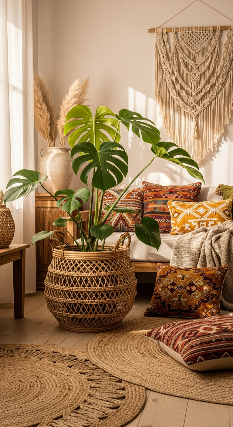 Le style bohème célèbre les matériaux naturels et les textures organiques. Une Monstera dans un cache-pot en rotin tressé incarne parfaitement cette esthétique chaleureuse et décontractée.