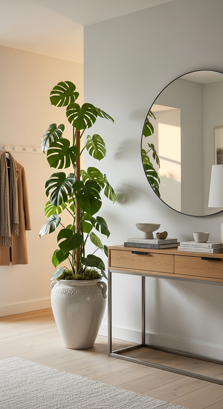 Astuce déco : Placez un grand miroir à proximité pour refléter la plante et créer une illusion d’espace plus grand et de verdure doublée. Ajoutez un tapis graphique et quelques accessoires métalliques (porte-parapluie, patères) pour un contraste moderne.