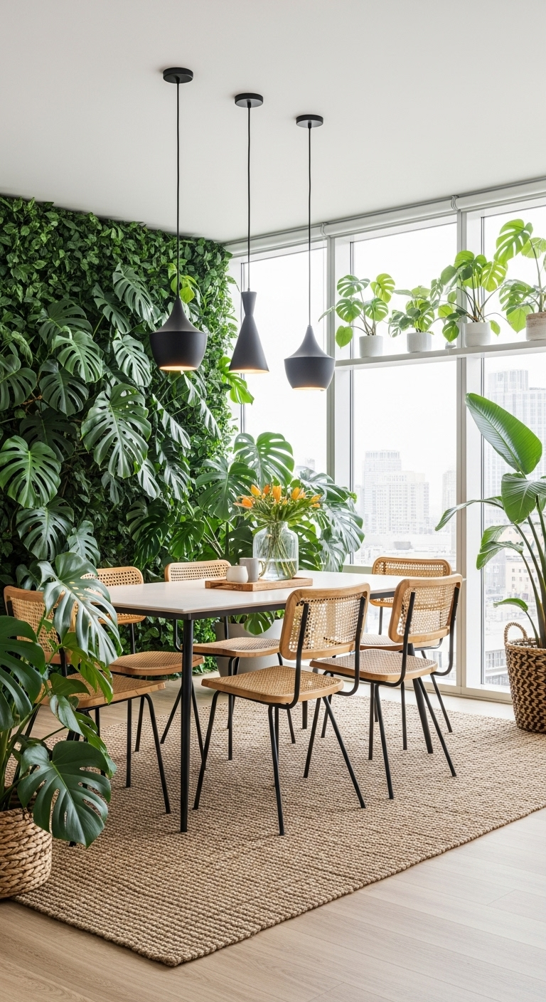 Astuce déco : Installez des suspensions lumineuses à hauteur variable au-dessus de la table pour créer différents niveaux visuels. Le soir, l’éclairage dirigé créera des ombres de feuilles spectaculaires sur les murs, comme des silhouettes naturelles en mouvement.