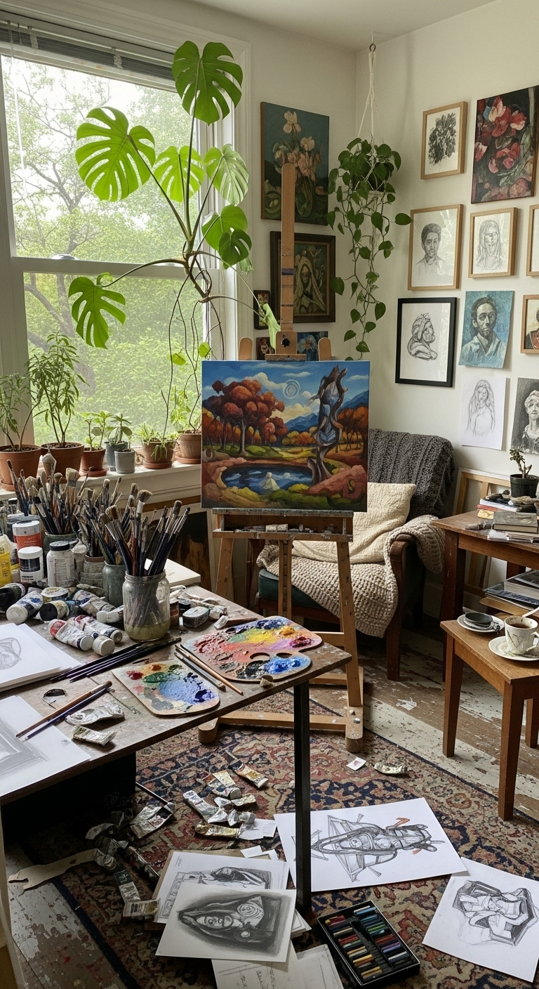Pour les âmes créatives, une Monstera dans un studio d’art apporte inspiration et connexion avec la nature. Ses formes organiques et ses motifs naturels ont inspiré d’innombrables artistes.