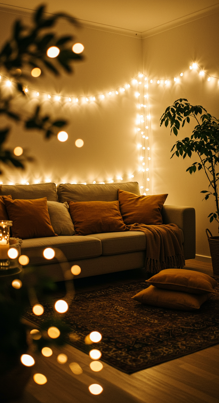 L’éclairage est l’âme d’un salon cosy. Les guirlandes lumineuses créent instantanément une atmosphère magique et chaleureuse. Contrairement à l’éclairage principal souvent trop vif, ces petites lumières diffusent une lueur douce et romantique qui invite à la détente.