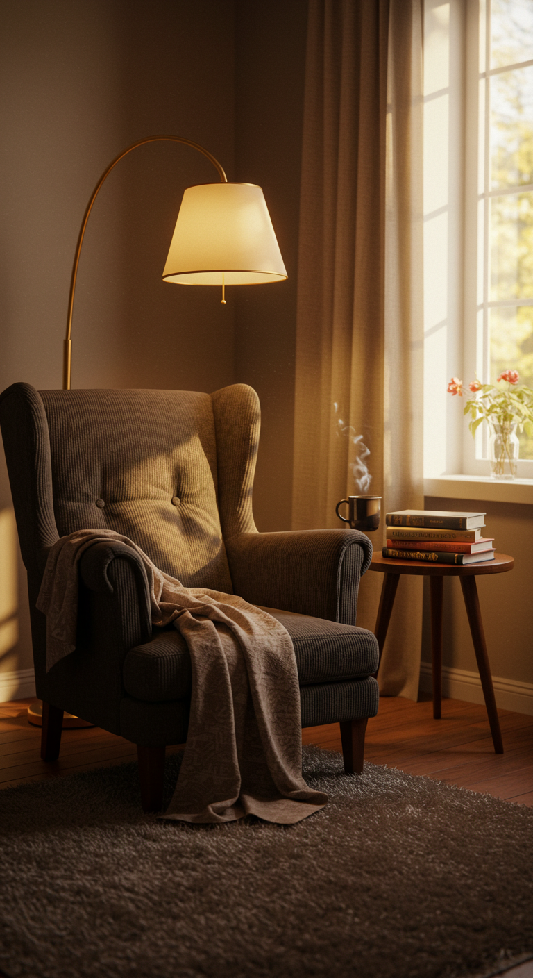Positionnez ce coin près d’une source de lumière naturelle, idéalement près d’une fenêtre. Ajoutez une lampe de lecture avec un abat-jour qui diffuse une lumière douce et dirigée. Une petite table d’appoint est indispensable pour poser votre tasse de thé, vos livres et vos lunettes.