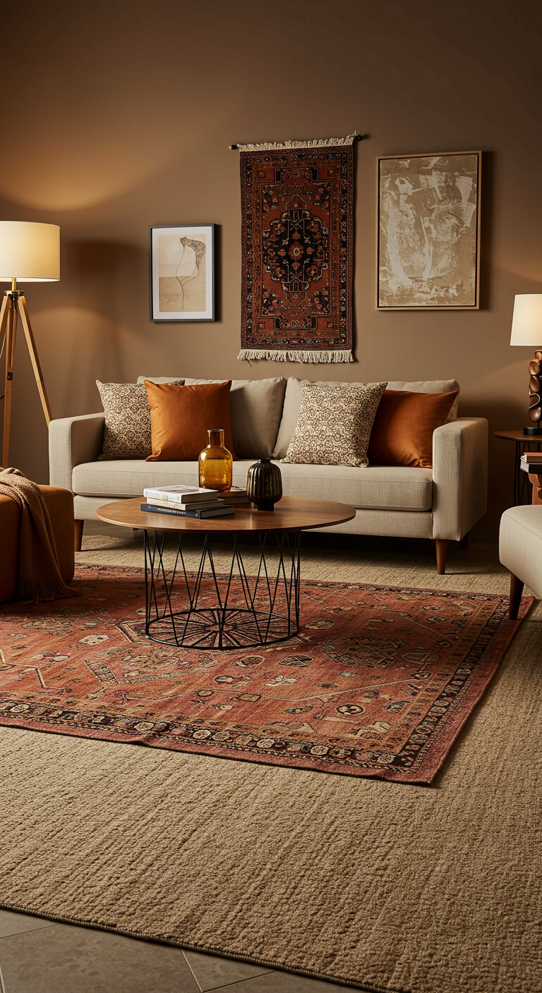 Jouez avec les textures : un tapis en laine bouclée avec un kilim plat, ou un tapis berbère avec un tapis persan vintage. Veillez à ce que les couleurs se complètent sans se faire concurrence. Cette astuce déco transformera instantanément l’atmosphère de votre salon en lui donnant un aspect plus sophistiqué et chaleureux.