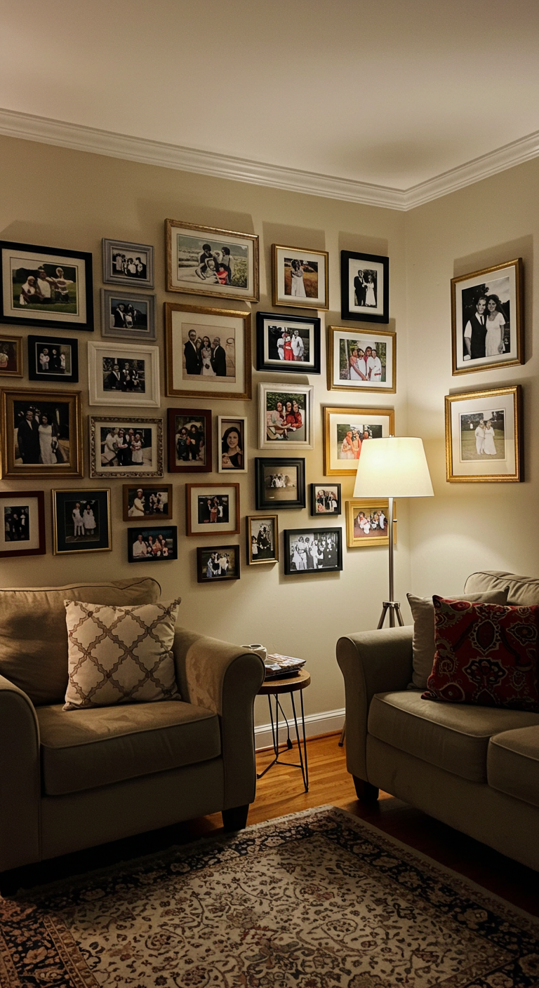 Rien ne rend un salon plus chaleureux et personnel qu’un mur de cadres avec vos souvenirs préférés. Cette décoration murale crée instantanément une connexion émotionnelle et raconte l’histoire de votre famille.