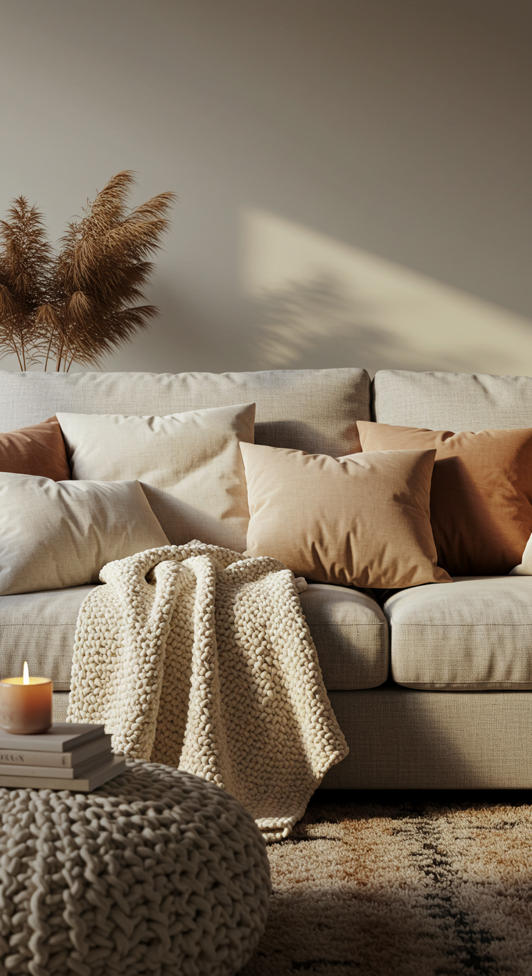 Les textiles sont l’essence même du style cosy. Multipliez les coussins de différentes tailles, formes et textures sur votre canapé pour créer un effet d’abondance confortable. Mélangez les matières : velours, lin, mohair, fausse fourrure.