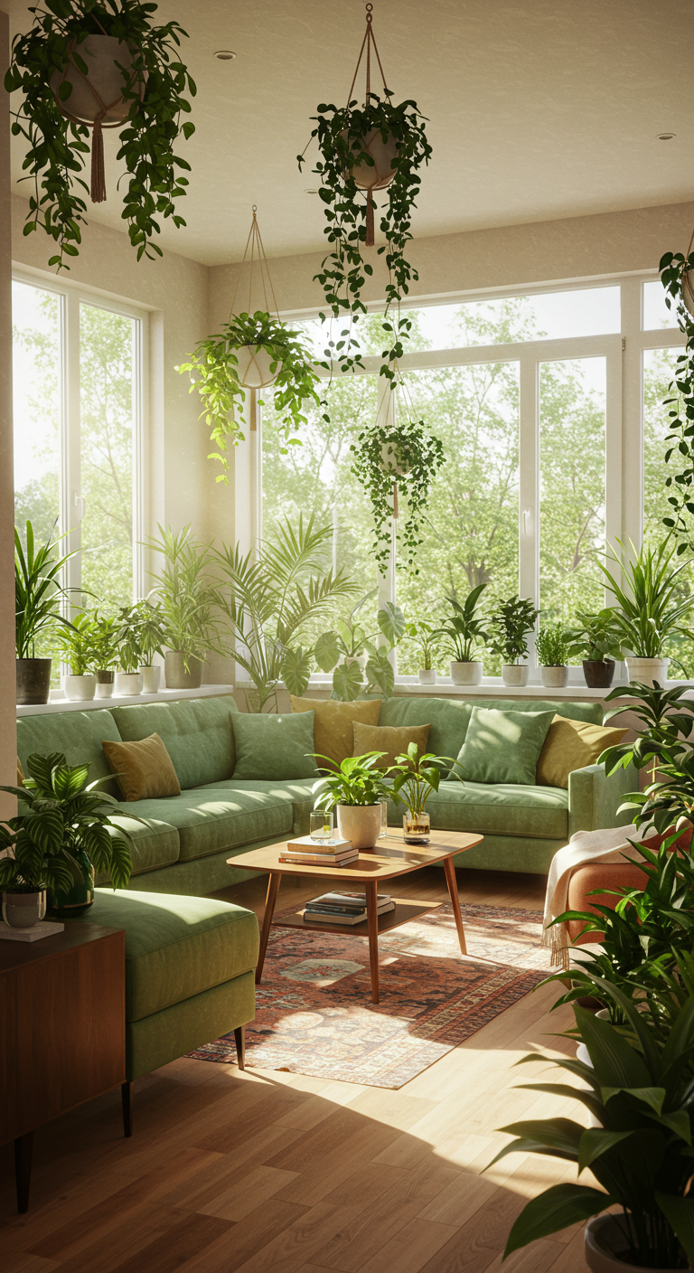 Pour les débutants, optez pour des plantes faciles d’entretien comme le pothos, la sansevieria ou le caoutchouc. Variez les hauteurs avec des plantes suspendues, des plantes sur pieds, et des compositions sur vos meubles. Les cache-pots en matières naturelles comme l’osier ou la terre cuite renforcent l’aspect cosy.