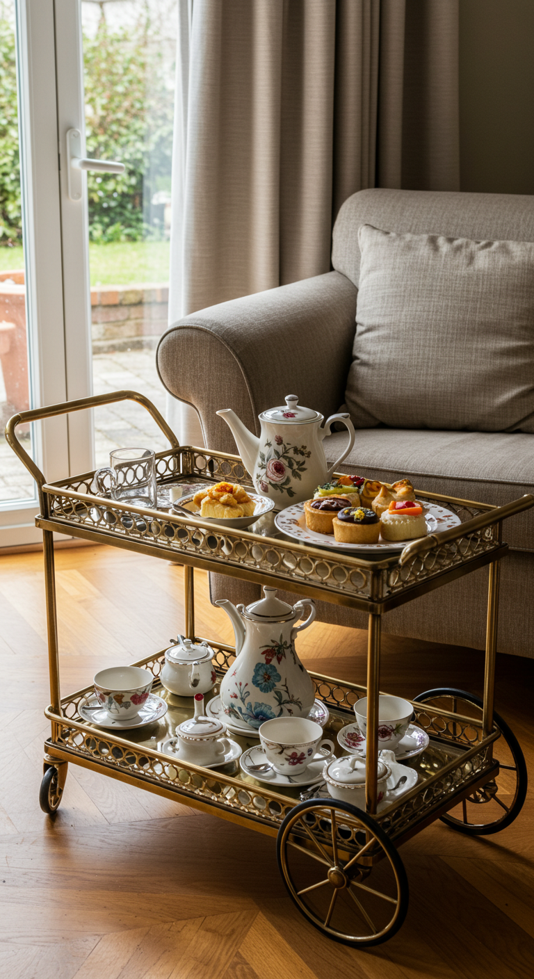Créer un coin thé dédié renforce l’aspect accueillant et convivial de votre salon. Une desserte mobile vous permet de préparer et servir thé ou café avec élégance tout en restant près de vos invités.