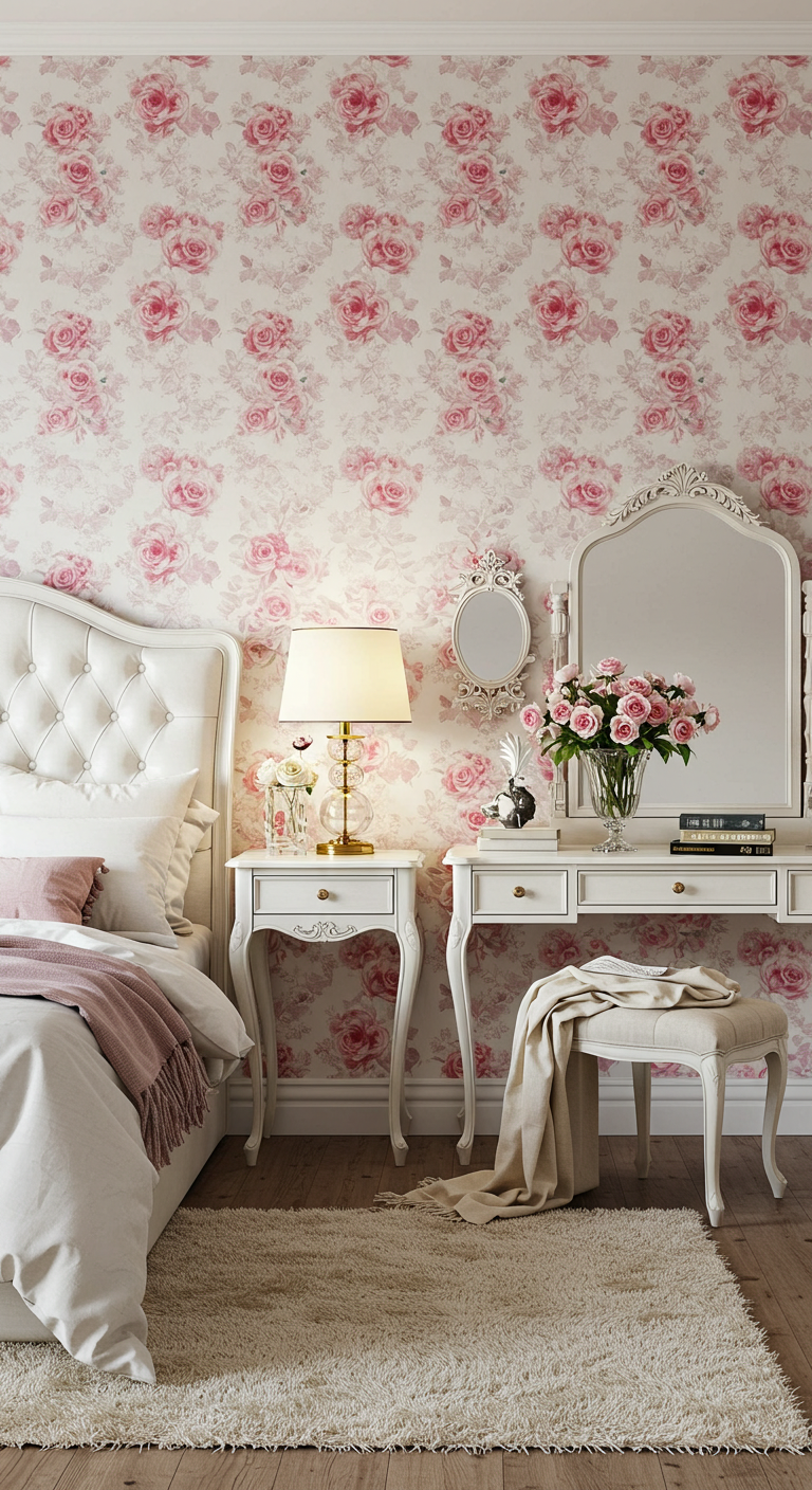 Optez pour un papier peint aux motifs floraux délicats sur fond blanc avec des fleurs rose poudré. Les motifs botaniques apportent une fraîcheur naturelle et une sophistication intemporelle. Choisissez des designs avec des roses, des pivoines ou des branches fleuries pour une ambiance jardin anglais. Appliquez ce papier peint sur un seul mur pour éviter la surcharge visuelle, ou sur tous les murs si la chambre est spacieuse. Cette solution décorative crée instantanément un caractère unique et une atmosphère romantique raffinée.
