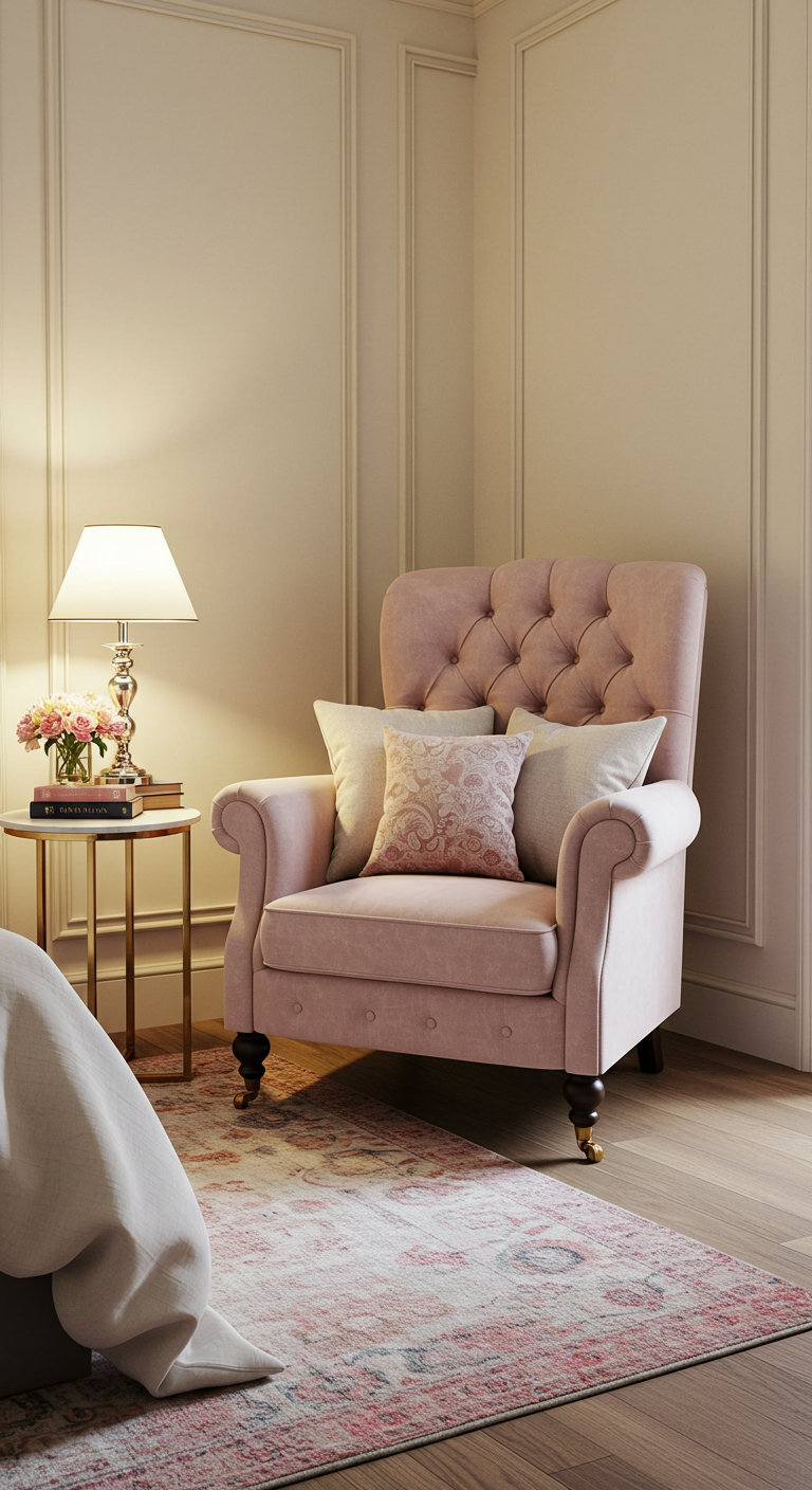 Intégrez un fauteuil capitonné en velours rose poudré pour créer un coin lecture romantique. Le capitonnage apporte une texture luxueuse et un style classique intemporel. Placez-le près d’une fenêtre avec un petit guéridon pour les livres et une tasse de thé. Ajoutez un coussin contrastant et un plaid pour parfaire le confort. Ce meuble devient un point focal élégant tout en offrant un espace de détente intime. Le velours rose poudré reflète subtilement la lumière, créant des jeux d’ombres sophistiqués.