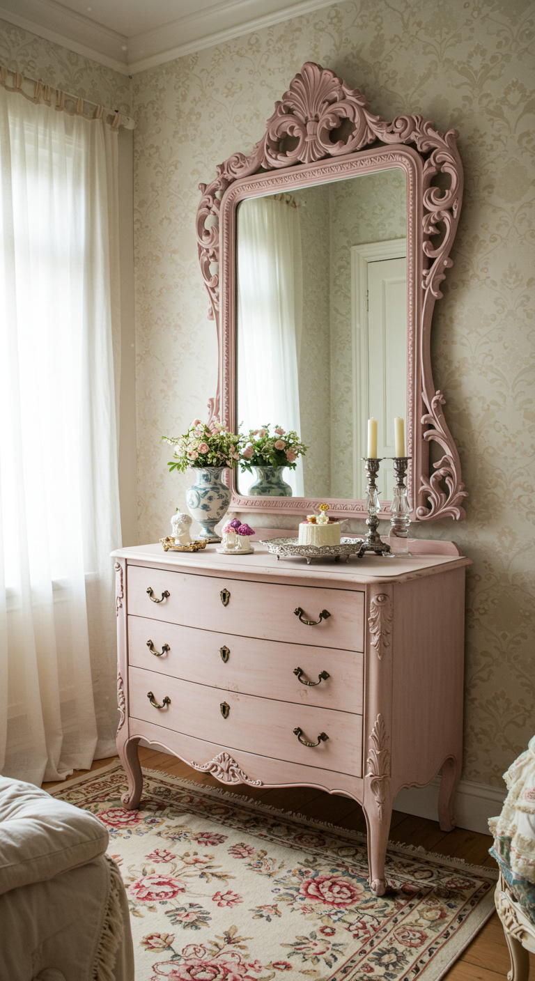 Transformez un miroir vintage en le peignant dans un rose poudré mat. Choisissez un modèle avec un cadre ouvragé de style baroque ou rococo pour accentuer le côté romantique. Placez-le au-dessus d’une commode ou d’une coiffeuse pour créer un ensemble harmonieux. La peinture rose adoucit les lignes parfois imposantes des miroirs anciens tout en leur donnant une seconde vie moderne. Ce type de pièce devient un véritable objet d’art qui personnalise votre décoration et reflète la lumière de façon flatteuse.