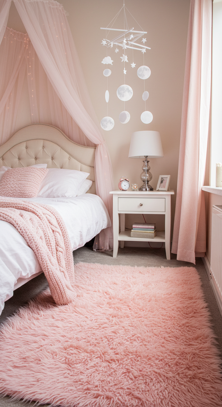 Ajoutez un tapis moelleux rose clair pour créer une zone de confort au pied du lit. La texture douce invite à la détente et ajoute une couche de chaleur visuelle et tactile. Choisissez un modèle suffisamment grand pour équilibrer les proportions de la pièce. Le tapis délimite l’espace nuit et absorbe les bruits de pas. Cette addition simple mais efficace transforme l’atmosphère de la chambre en apportant douceur et confort. Privilégiez des matières naturelles comme la laine ou le coton pour un toucher agréable.