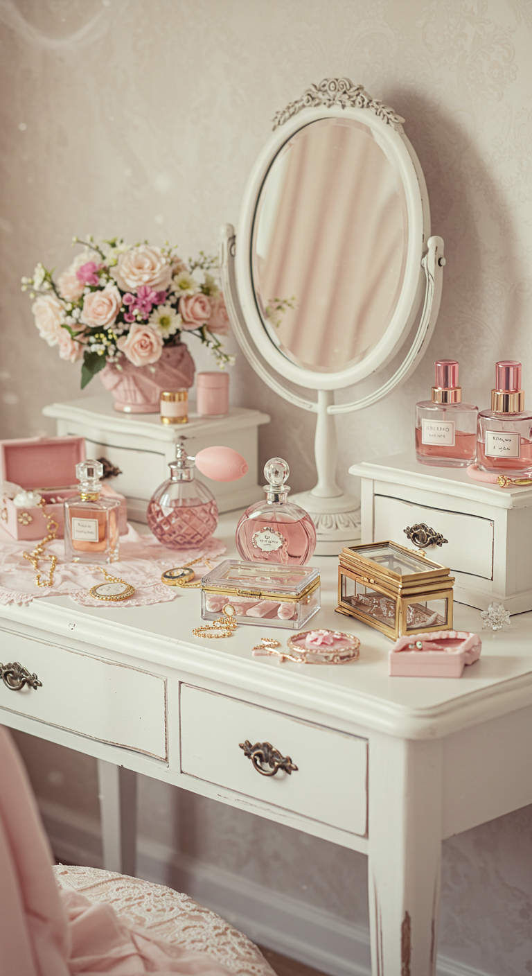 Aménagez une coiffeuse blanche agrémentée d’accessoires rose poudré pour créer un espace beauté romantique. Disposez des flacons de parfum, des boîtes à bijoux et des pinceaux dans des tons roses coordonnés. Cette zone dédiée au rituel beauté évoque l’élégance d’antan tout en restant fonctionnelle. La combinaison blanc-rose apporte fraîcheur et féminité. Ajoutez un tabouret capitonné rose et quelques fleurs fraîches pour parfaire l’ensemble. Cet espace devient un véritable boudoir personnel où prendre soin de soi devient un plaisir quotidien.