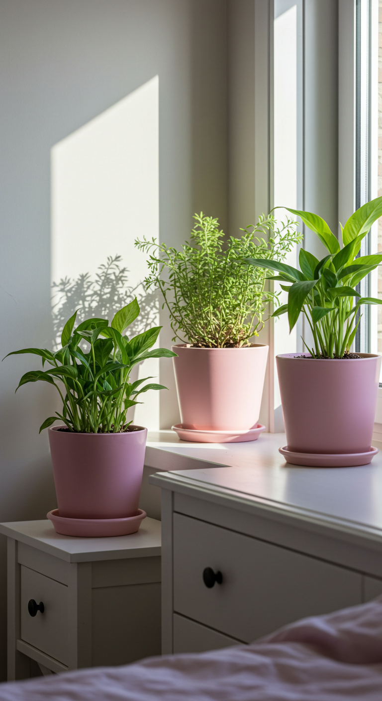 Intégrez des plantes vertes dans des cache-pots rose poudré pour apporter vie et fraîcheur à votre décoration. Le contraste entre le vert des feuillages et le rose des contenants crée un équilibre naturel harmonieux. Choisissez des plantes adaptées à la lumière de votre chambre : pothos, sansevieria ou ficus pour les espaces moins lumineux. Cette touche végétale purifie l’air et ajoute une dimension organique à la décoration. Les plantes apportent également une sensation de bien-être et de connexion avec la nature.