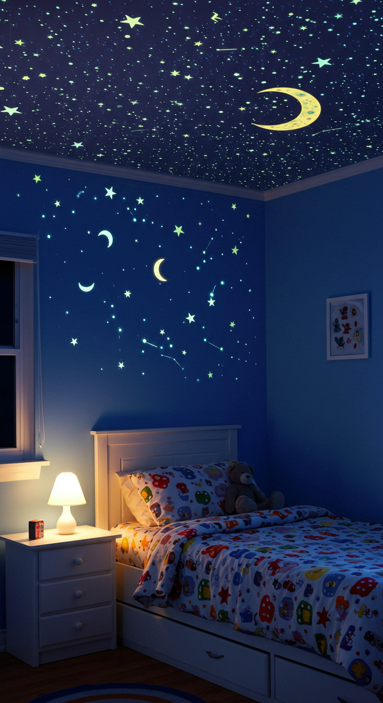 Un plafond étoilé fluorescent transforme chaque nuit en aventure spatiale. Cette décoration utilise des autocollants phosphorescents qui se chargent à la lumière du jour et brillent doucement dans l’obscurité.