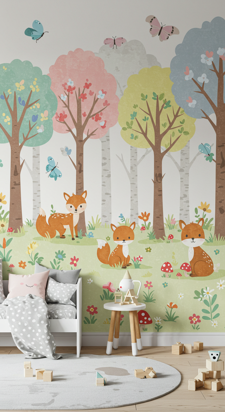 Les stickers muraux forêt enchantée créent un univers narratif complet. Cette décoration évolutive peut être modifiée selon les goûts de l’enfant.