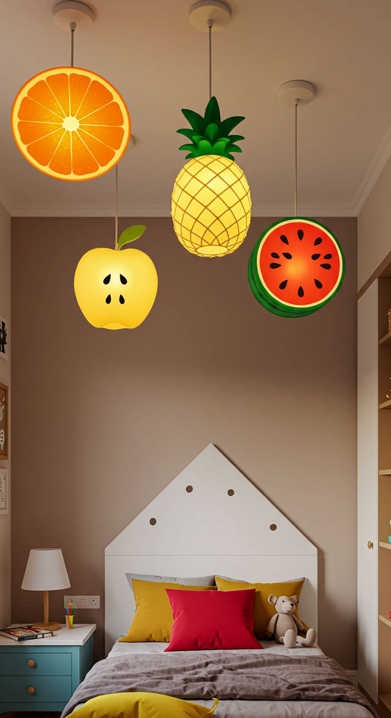 Les luminaires en forme de fruits apportent couleur et fantaisie tout en assurant un éclairage fonctionnel. Ces suspensions créent une ambiance joyeuse et stimulent l’appétit pour les vrais fruits.
