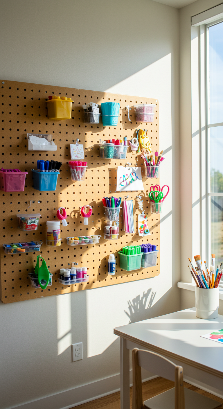 Le panneau perforé coloré transforme un mur en atelier créatif organisé. Cette solution modulaire s’adapte aux activités et passions de l’enfant.