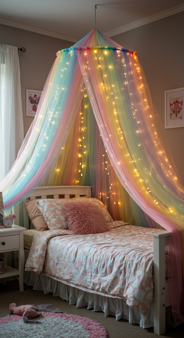 Le ciel de lit en tulle multicolore crée une atmosphère féerique tout en délimitant l’espace repos. Cette décoration romantique convient particulièrement aux chambres de petites filles mais peut être adaptée pour tous.