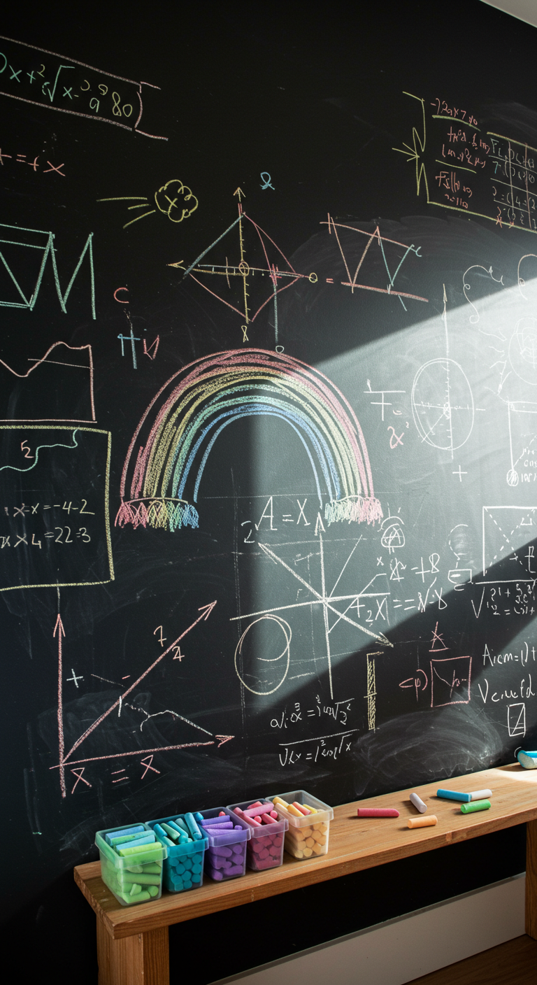 Un mur d’ardoise colorée offre un espace d’expression infini. Utilisez de la peinture ardoise teintée ou créez des sections géométriques avec différentes couleurs d’ardoise.