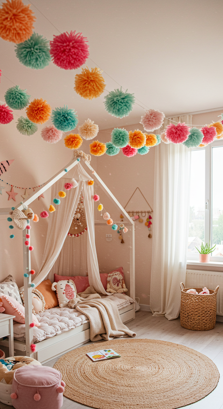 Les guirlandes de pompons géants apportent texture, couleur et mouvement à la chambre. Ces éléments décoratifs créent une atmosphère festive et chaleureuse.