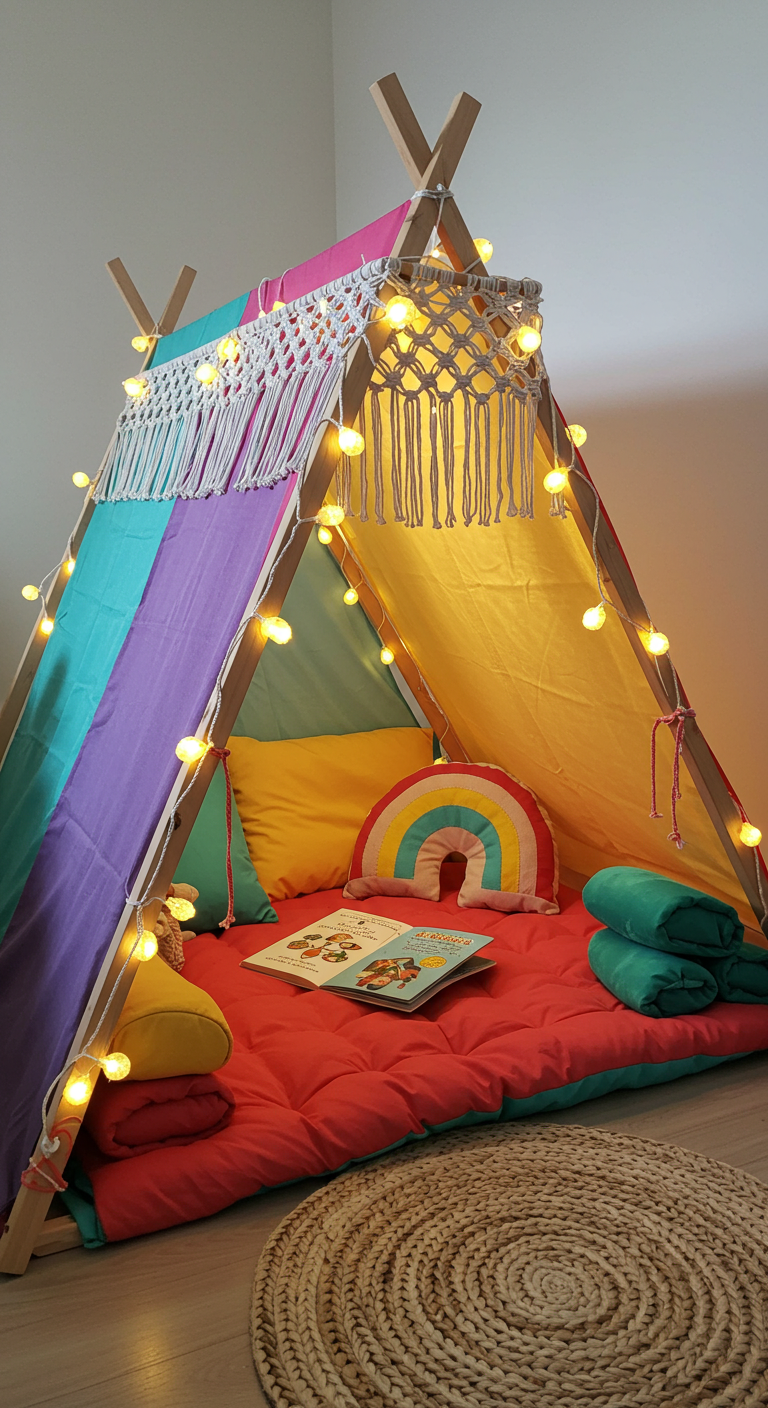 Une tente de lecture colorée offre un espace intime où l’enfant peut se retirer pour lire, rêver ou jouer calmement. Le style bohème apporte une dimension cosy et personnelle.