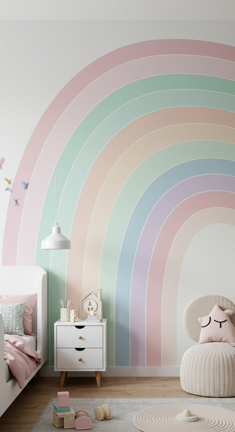 L’arc-en-ciel pastel est la tendance phare en décoration enfantine. Cette idée consiste à peindre un mur avec des bandes douces aux couleurs de l’arc-en-ciel en version pastel. Contrairement aux couleurs vives traditionnelles, les tons pastel apportent une sérénité tout en conservant la joie et l’optimisme.