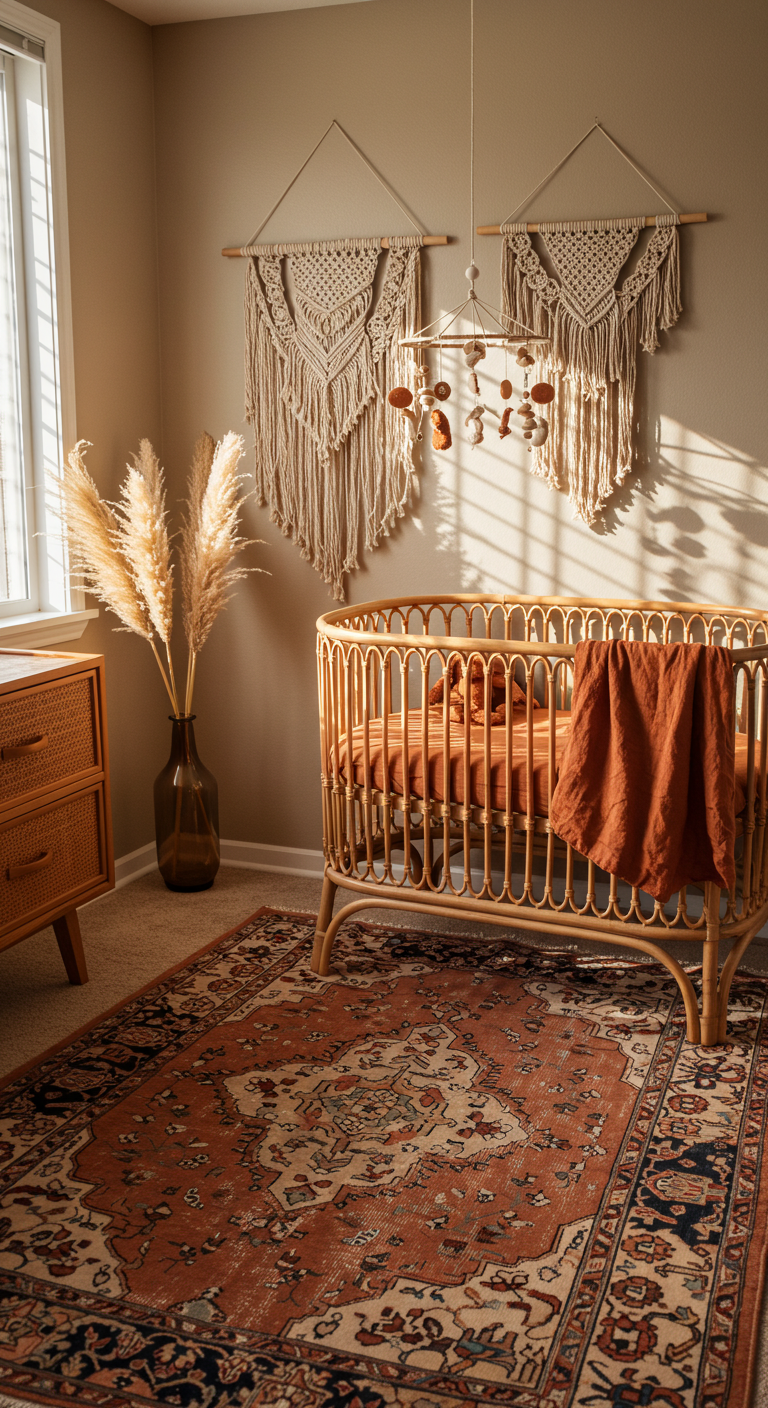 Le style bohème apporte chaleur et caractère à la chambre bébé. Mélangez les textures avec des suspensions en macramé, des tapis vintage aux motifs géométriques, et des paniers en rotin. Les tons terreux comme le terracotta, le sage et le beige créent une ambiance cocooning parfaite.
