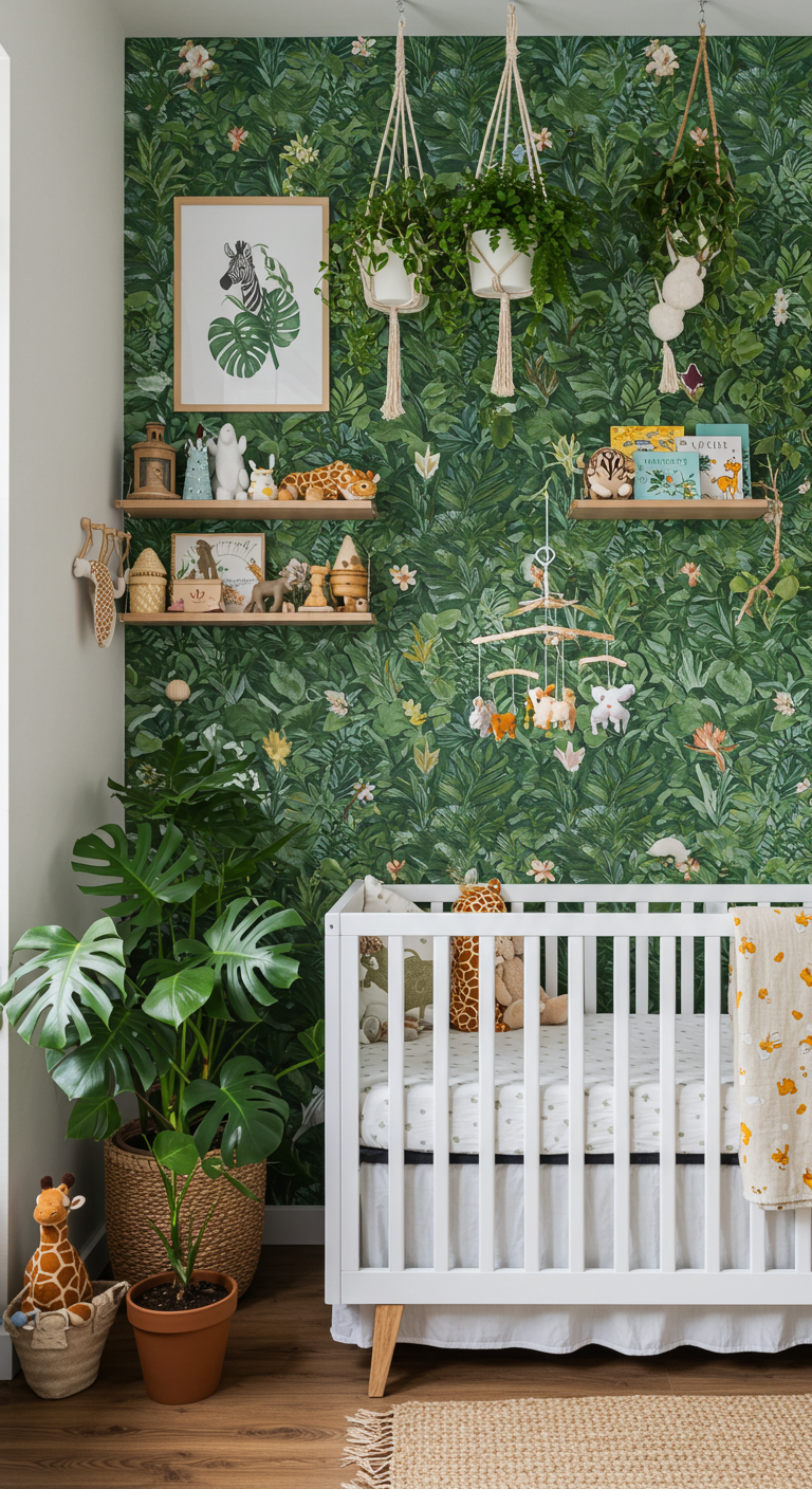 Utilisez un papier peint à motifs de feuilles tropicales sur un mur d’accent, tout en gardant les autres murs neutres. Intégrez de vraies plantes suspendues (hors de portée de bébé) et des reproductions d’animaux stylisés. Les tons de vert se marient parfaitement avec des accents de bois naturel et des touches dorées. Cette décoration encourage le développement de la conscience environnementale dès le plus jeune âge.