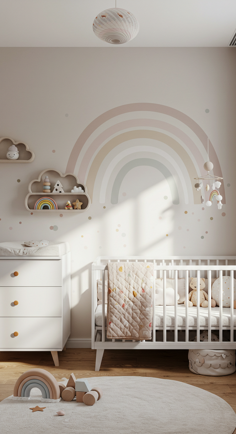 L’arc-en-ciel revisité de manière subtile apporte joie et optimisme sans surcharger l’espace. Optez pour des tons adoucis plutôt que des couleurs vives : rose poudré, pêche, jaune miel, vert sage, bleu glacier, lavande.