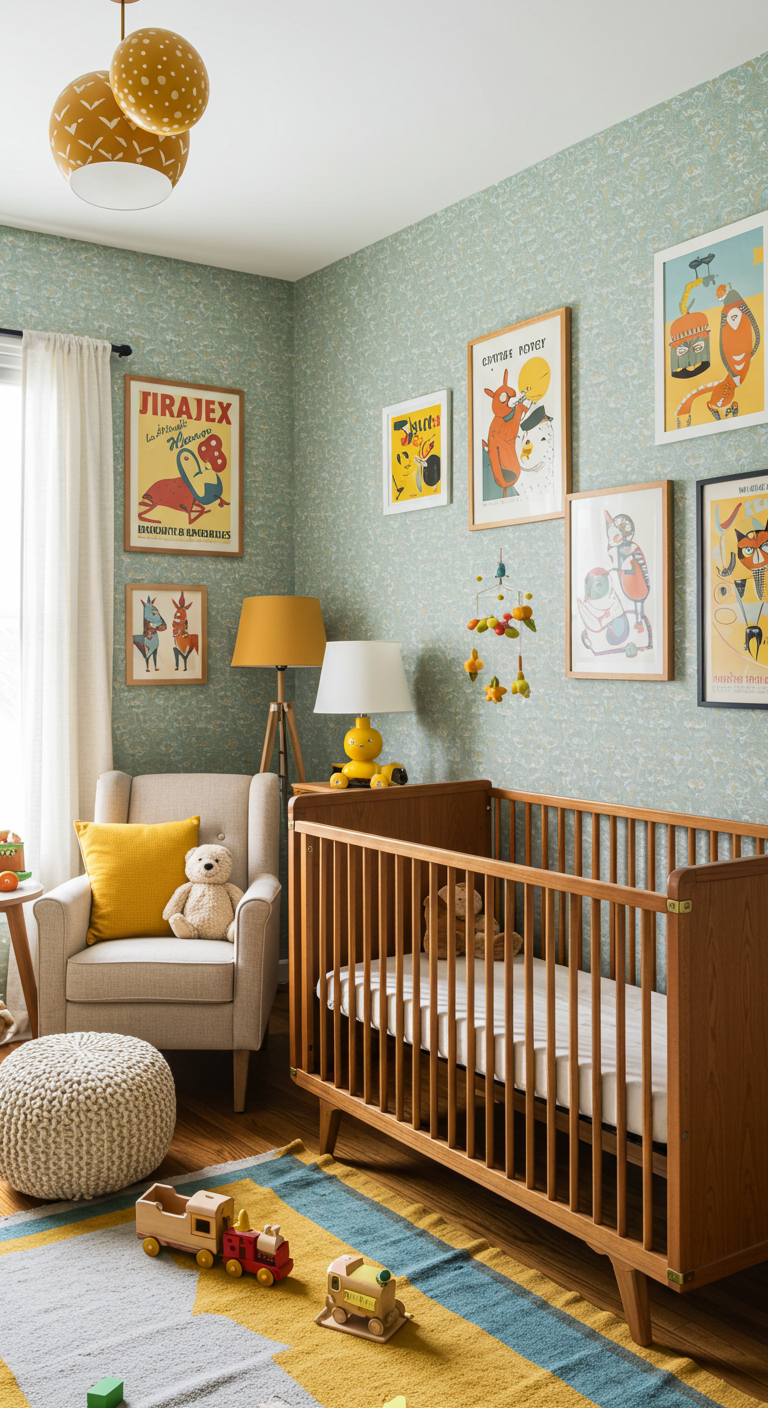 Les affiches vintage encadrées, les luminaires en laiton et les tissus texturés apportent du caractère. Cette esthétique crée une atmosphère chaleureuse et sophistiquée qui traverse les générations. Les jouets en bois classiques et les livres anciens complètent parfaitement ce thème nostalgique mais actuel.