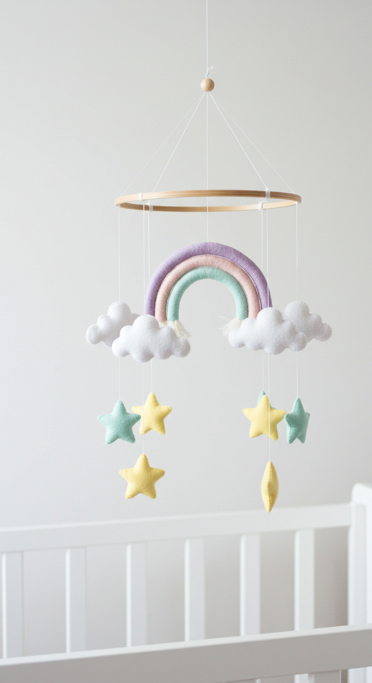 Créez ou choisissez un mobile musical aux couleurs de l’arc-en-ciel pastel. Les formes douces en feutrine – nuages, étoiles, ou petits animaux – captiveront l’attention de bébé tout en développant sa coordination œil-main. Les teintes poudrées apportent de la couleur sans agresser la vue.
