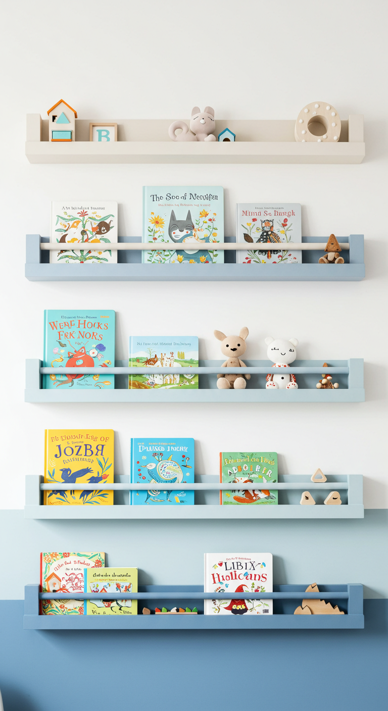 Installez des étagères en forme de maison, peintes en rose poudrée avec des détails en bois naturel. Ces étagères fonctionnelles deviennent de véritables éléments décoratifs. Elles créent un village miniature sur le mur tout en offrant de l’espace de rangement pour les jouets et livres.