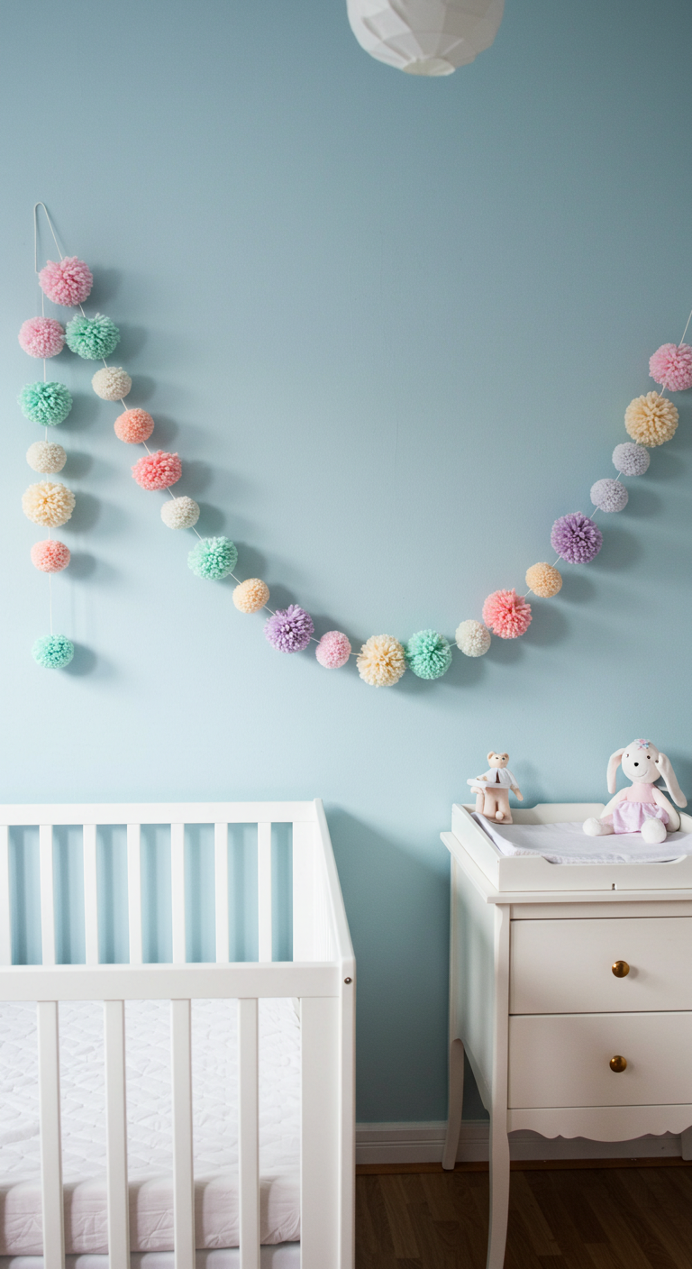 Confectionnez une guirlande de pompons dans toutes les nuances pastel : rose, pêche, menthe, lavande, crème. Cette décoration artisanale apporte texture et couleur de manière subtile. Disposez-la le long d’un mur, autour d’une fenêtre, ou au-dessus du lit de bébé (en respectant les distances de sécurité).