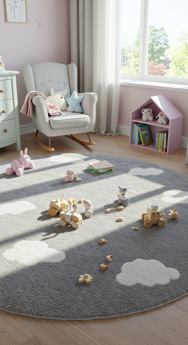 Un grand tapis rond gris très clair avec des motifs de nuages blancs crée une zone de jeu douce et délimitée. Cette pièce centrale apporte chaleur et confort tout en définissant l’espace de jeu. Les motifs nuageux s’harmonisent parfaitement avec une déco pastel.