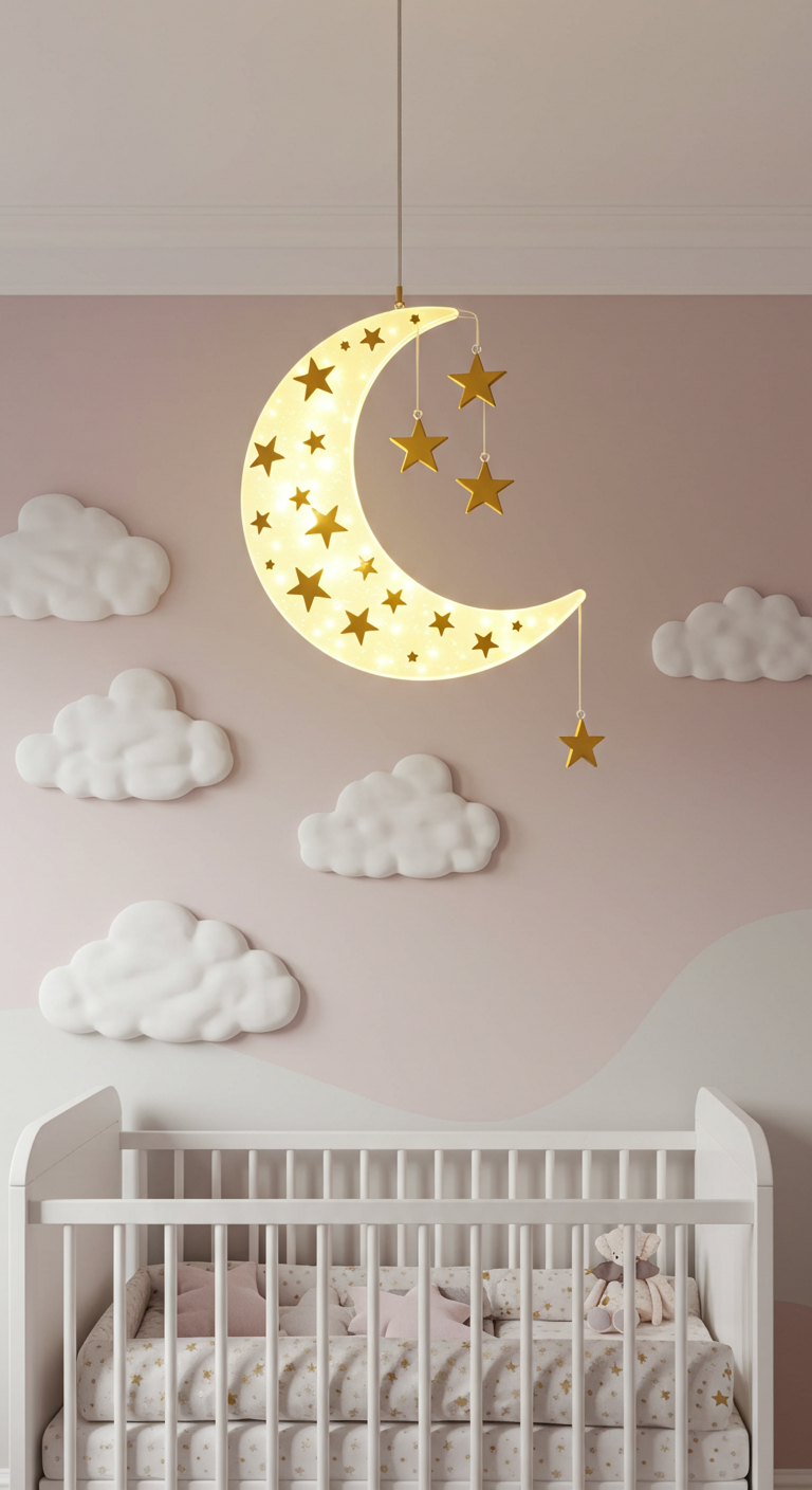 Choisissez une suspension en forme de croissant de lune avec des étoiles dorées suspendues. Cet éclairage thématique diffuse une lumière douce et crée des ombres féeriques au plafond. L’or apporte une touche d’élégance sans rompre l’harmonie pastel.