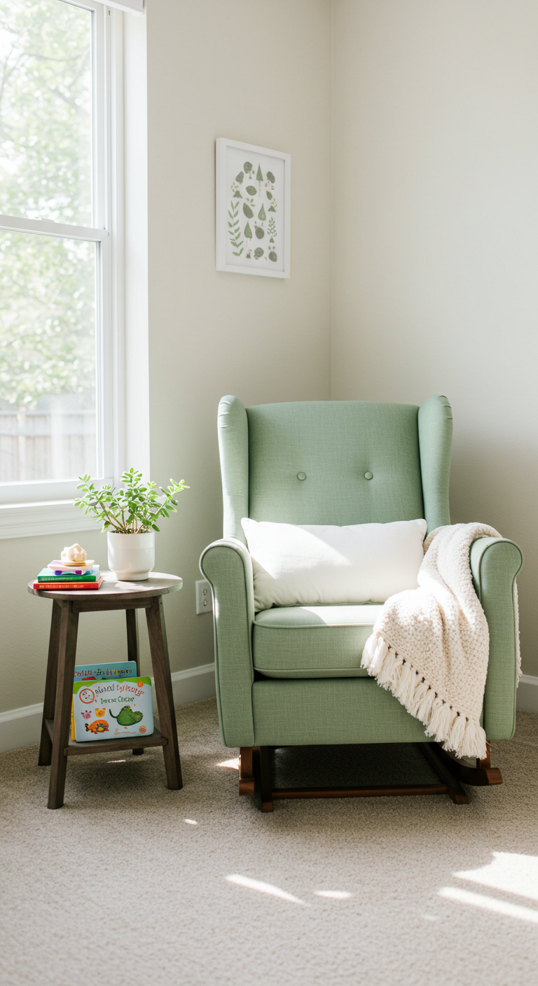 Aménagez un coin détente avec un fauteuil à bascule dans un joli vert sauge. Ajoutez des coussins blancs moelleux et un plaid dans les tons pastel. Ce coin devient l’endroit privilégié pour l’allaitement, les câlins et les moments de tendresse.